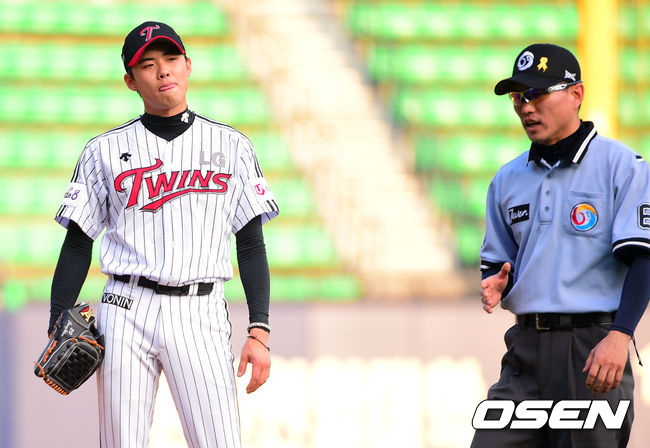 24일 오후 서울 잠실구장에서 열린 2014 한국야쿠르트 세븐 프로야구 LG 트윈스와 NC 다이노스의 경기,2회초 2사 2,3루 NC 김종호의 타석때 보크 판정을 받은 LG 선발투수 임정우가 권영철 2루심에게 항의하고 있다.