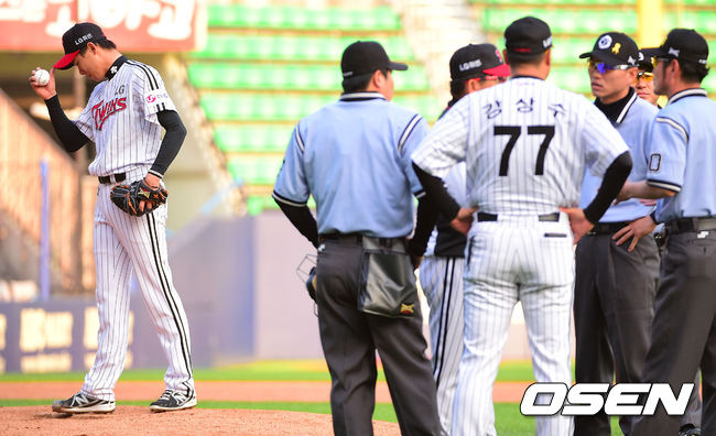 24일 오후 서울 잠실구장에서 열린 2014 한국야쿠르트 세븐 프로야구 LG 트윈스와 NC 다이노스의 경기,2회초 2사 2,3루 NC 김종호의 타석때 보크 판정을 받은 LG 선발투수 임정우가 아쉬워하고 있다