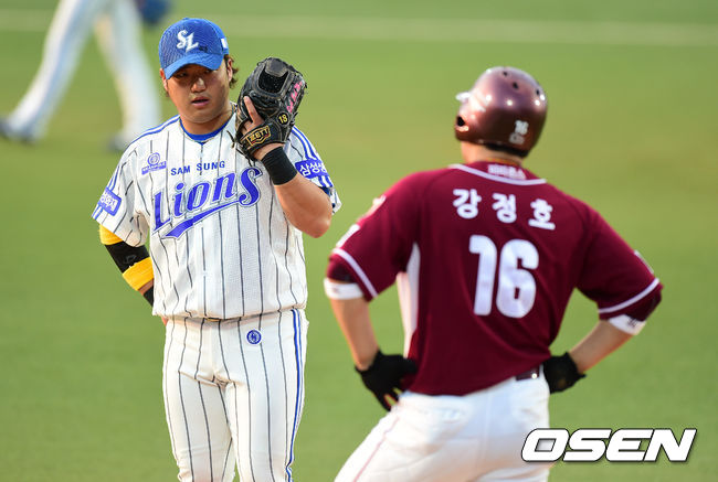 2회초 무사 1,3루에서 삼성 박석민이 넥센 강정호와 이야기를 나누며 아쉬워하고 있다. 박석민은 무사 1루에서 강정호의 3루땅볼에 1루 악송구로 실점을 허용했다..