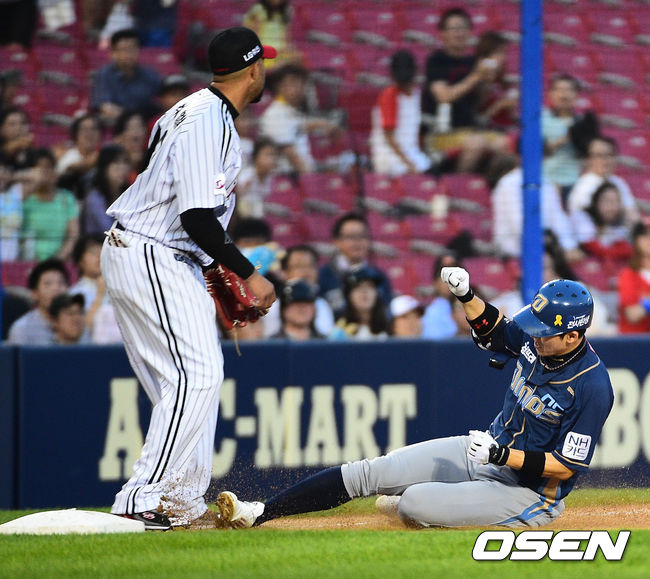 24일 오후 서울 잠실구장에서 열린 2014 한국야쿠르트 세븐 프로야구 LG 트윈스와 NC 다이노스의 경기,4회초 1사 1,2루 NC 박민우가 2타점 3루타를 날리고 3루에 세이프 되고 있다.