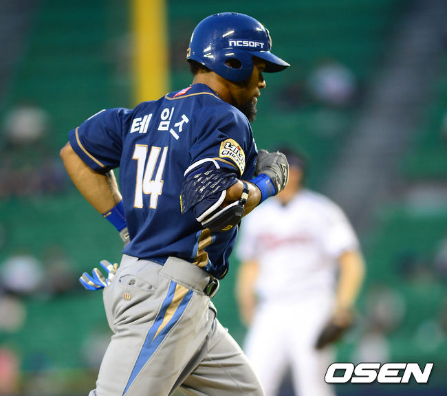 24일 오후 서울 잠실구장에서 열린 2014 한국야쿠르트 세븐 프로야구 LG 트윈스와 NC 다이노스의 경기, 5회초 첫타자로 나온 테임즈가 6구째를 받아쳐 임정우를 상대로 홈런을 치고 베이스를 돌고 있다.