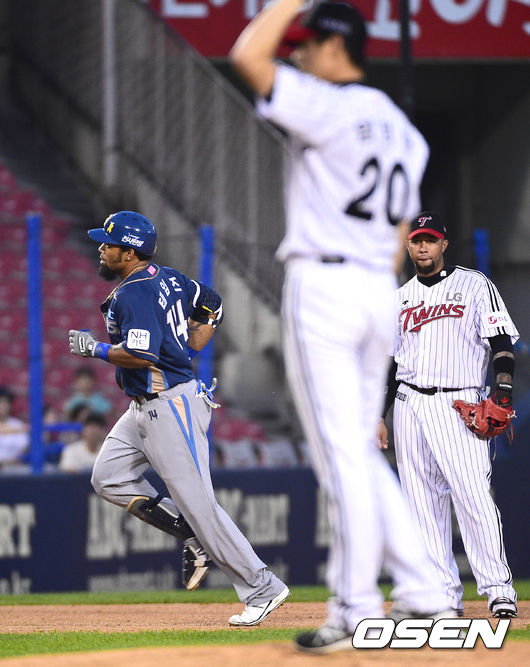 24일 오후 서울 잠실구장에서 열린 2014 한국야쿠르트 세븐 프로야구 LG 트윈스와 NC 다이노스의 경기,5회초 1사 NC 테임즈가 솔로홈런을 날린후 베이스를 돌고 있다.