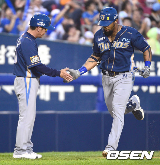 24일 오후 서울 잠실구장에서 열린 2014 한국야쿠르트 세븐 프로야구 LG 트윈스와 NC 다이노스의 경기,5회초 1사 NC 테임즈가 솔로홈런을 날린후 이광길 3루 코치와 하이파이브르 하고 있다.