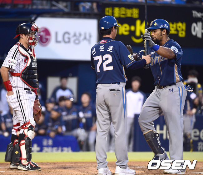 24일 오후 서울 잠실구장에서 열린 2014 한국야쿠르트 세븐 프로야구 LG 트윈스와 NC 다이노스의 경기,5회초 1사 NC 테임즈가 솔로홈런을 날린후 전준호 코치와 하이파이브를 하고 있다