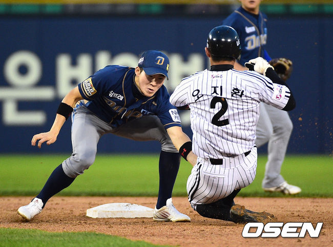 24일 오후 서울 잠실구장에서 열린 2014 한국야쿠르트 세븐 프로야구 LG 트윈스와 NC 다이노스의 경기,4회말 1사 1루 LG 정성훈의 낫아웃때 1루 주자 오지환이 도루 실패하고 있다.