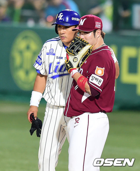 5회말 2사 1,2루에서 삼성 이승엽이 1타점 적시타를 날리고 넥센 박병호와 이야기를 나누고 있다.