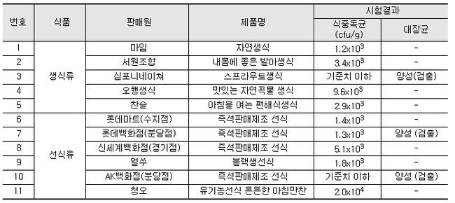 특히, 유명 백화점 및 대형마트에서 판매 중인 즉석 제조선식 8개 중 4개 제품(롯데마트, 롯데백화점, 신세계백화점, AK백화점)이 식중독균 또는 대장균에 오염된 것으로 확인되어 안전성이 취약한 것으로 나타났다.