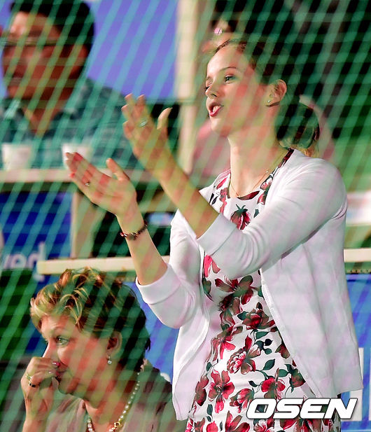 삼성 밴덴헐크의 아내 애나가 5회말 삼성 공격에서 득점에 성공하자 자리에서 일어나 열띤 응원을 하고 있다.
