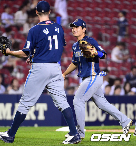 24일 오후 서울 잠실구장에서 열린 2014 한국야쿠르트 세븐 프로야구 LG 트윈스와 NC 다이노스의 경기,8회말 LG 공격을 막은 NC 찰리가 이닝종료 후 손시헌의 축하를 받으며 더그아웃으로 들어가고 있다.찰리는 8회까지 노히트 노런 기록을 이어가고 있다.