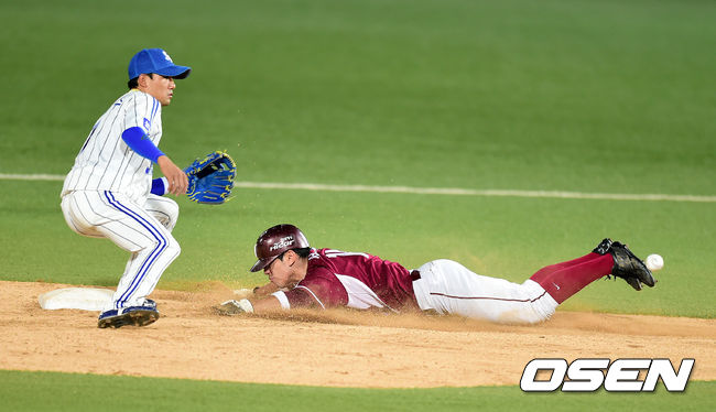 7회초 1사 1루에서 넥센 서건창이 2루 도루에 성공하고 있다.