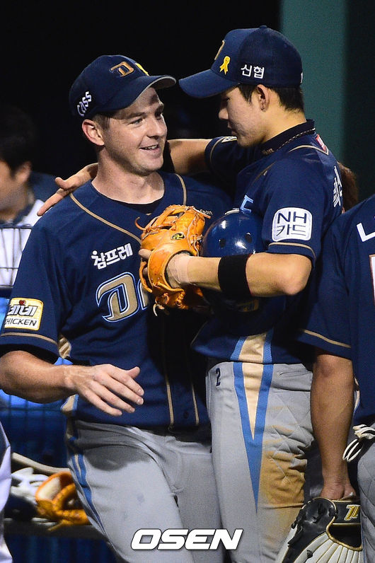 경기종료 후 찰리가 6회 호수비를 펼친 박민우와 기뻐하고 있다.