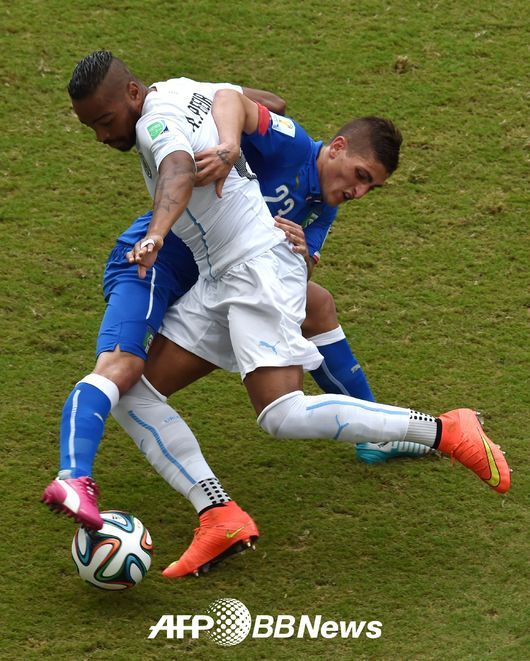 우루과이 페레이라와 이탈리아 베라티가 볼 다툼을 벌이고 있다.