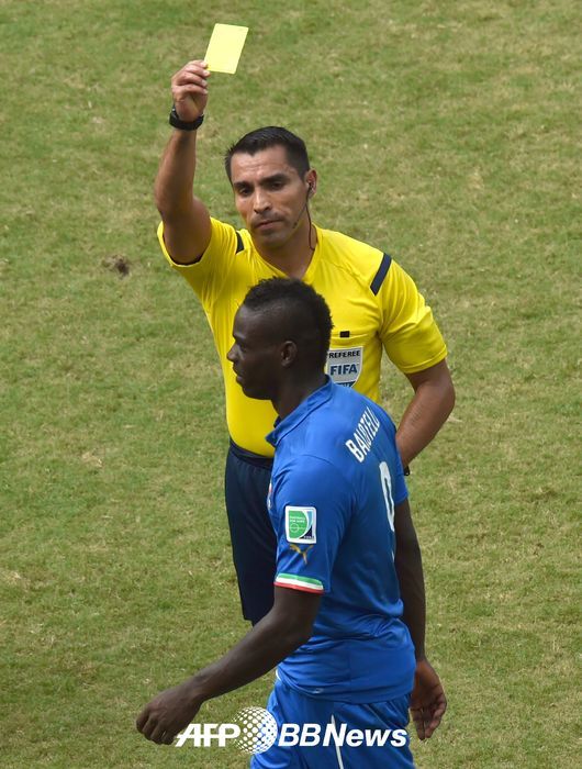 이탈리아 발로텔리가 주심에게 옐로우 카드를 받고 있다.