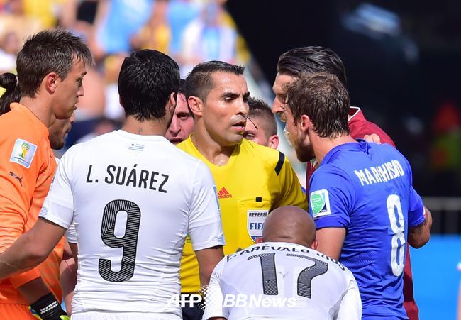 이날 경기 중 수아레스는 사고를 쳤다. 그는 후반 35분 공을 경합하는 과정에서 키엘리니의 어깨를 물었다. 키엘리니는 어깨를 보여주며 억울함을 호소했다. 하지만 심판이 제대로 보지 못해 경고는 나오지 않았다. 앞서 후반 16분 이탈리아의 마르키시오는 상대방 종아리를 밟았다는 이유로 즉각 퇴장을 받았다.