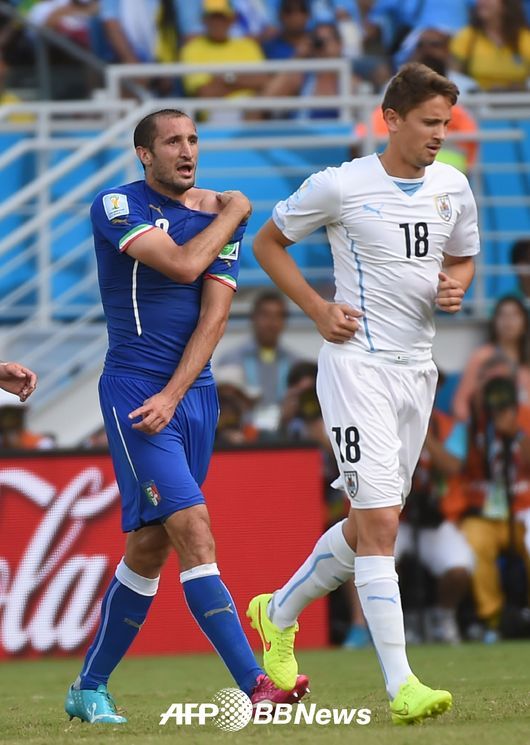 이탈리아 키엘리니가 우루과이 수아라즈에게 어깨를 물린 뒤 고통을 호소하고 있다./photo@osen.co.kr