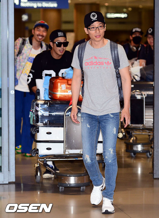 무한도전 응원단이 입국장을 빠져나오고 있다.