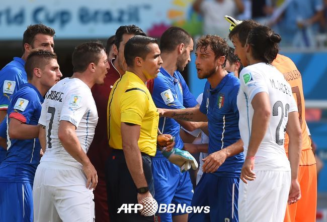 그런데 경기 중 수아레스는 사고를 쳤다. 그는 후반 35분 공을 경합하는 과정에서 키엘리니의 어깨를 물었다. 키엘리니는 어깨를 보여주며 억울함을 호소했다. 하지만 심판이 제대로 보지 못해 경고는 나오지 않았다. 앞서 후반 16분 이탈리아의 마르키시오는 상대방 종아리를 밟았다는 이유로 즉각 퇴장을 받았다.