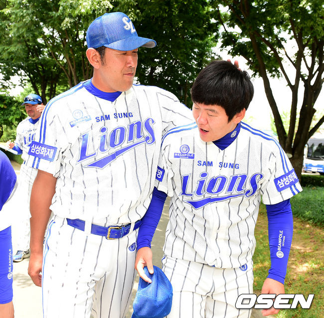 삼성 카도쿠라 코치가 이수민과 이야기를 나누고 있다.