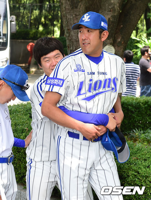 개관식을 마치고 삼성 이수민이 카도쿠라 코치에 장난을 치고 있다.