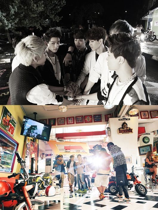첫 번째 사진은 뮤직비디오만큼이나 신나는 느낌의 촬영장 모습을, 두 번째 컷은 촬영 전 진지한 멤버들의 모습을 담았다. 사진 속 갓세븐은 다함께 '파이팅'하려는 듯 손을 모으고 있다.