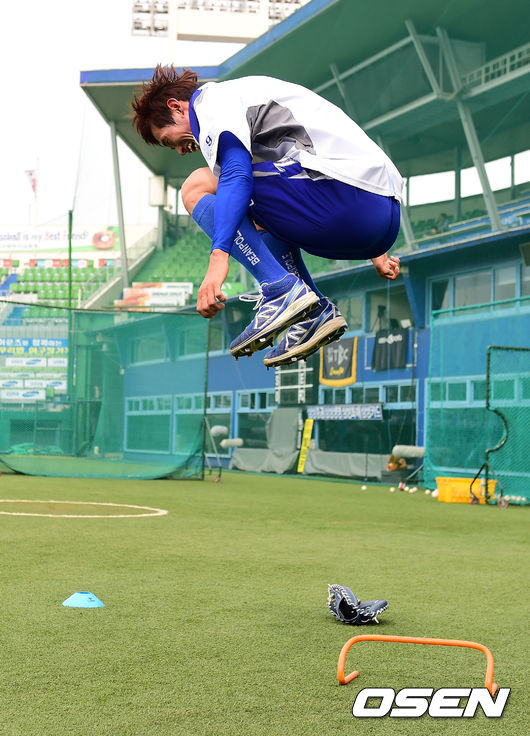 경기에 앞서 삼성 강명구가 훈련을 하고 있다.