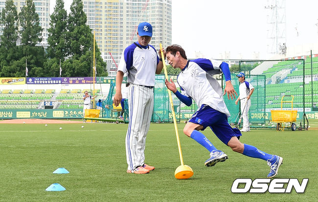 경기에 앞서 삼성 강명구가 훈련을 하고 있다.