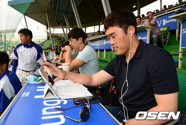 경기에 앞서 은퇴를 선언한 롯데 조성환이 대구구장을 찾아 기록원 업무를 배우고 있다.