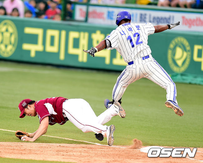 1회말 무사에서 삼성 나바로가 1루 땅볼을 날렸지만 베이스 커버를 들어 온 넥센 금민철이 송구를 놓치며 세이프되고 있다.