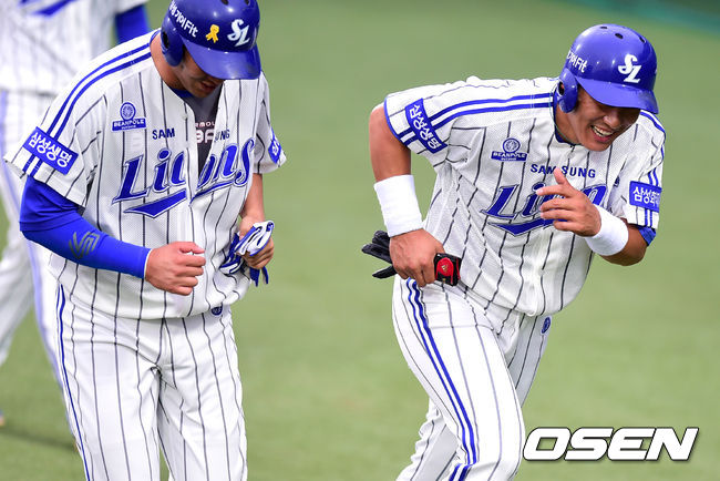 1회말 2사 2,3루에서 삼성 이승엽이 김태완의 2타점 우전 적시타에 홈을 밟고 채태인과 기뻐하고 있다.
