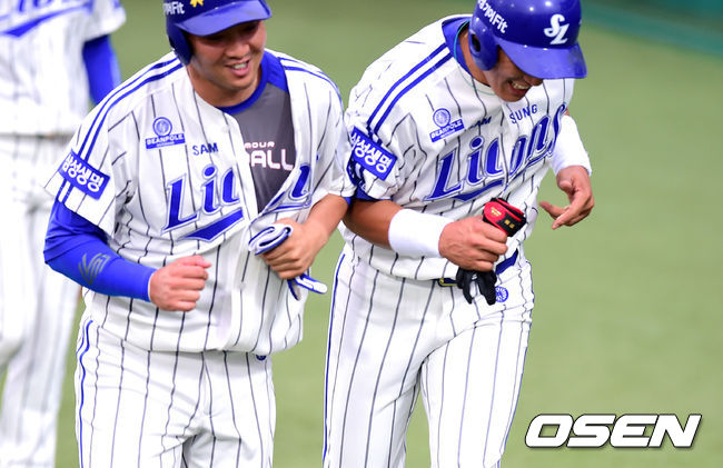 1회말 2사 2,3루에서 삼성 이승엽이 김태완의 2타점 우전 적시타에 홈을 밟고 채태인과 기뻐하고 있다.