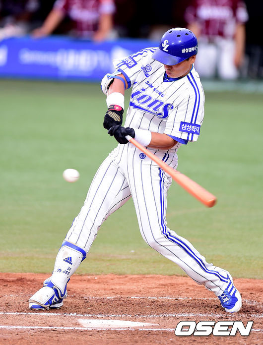 1회말 2사 1,2루에서 삼성 이승엽이 1타점 선제 2루타를 날리고 있다.