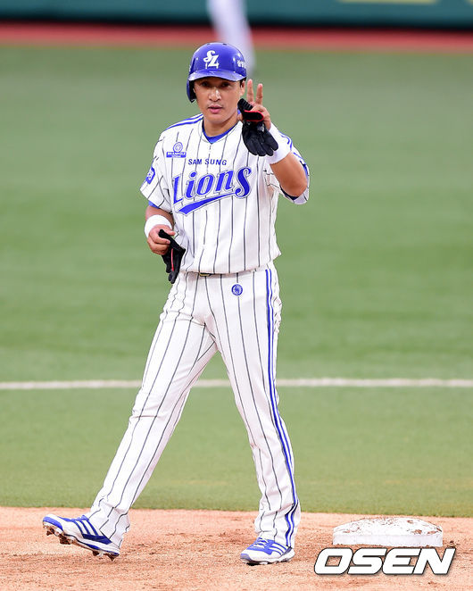1회말 2사 1,2루에서 삼성 이승엽이 1타점 선제 2루타를 날리고 타임을 외치고 있다.