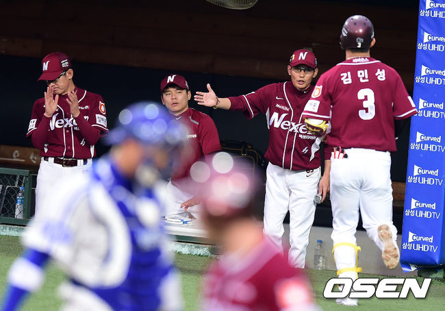2회초 무사 1루에서 넥센 김민성이 삼성 배영수를 상대로 투런포를 날리고 더그아웃에서 염경엽 감독과 하이파이브를 하고 있다.