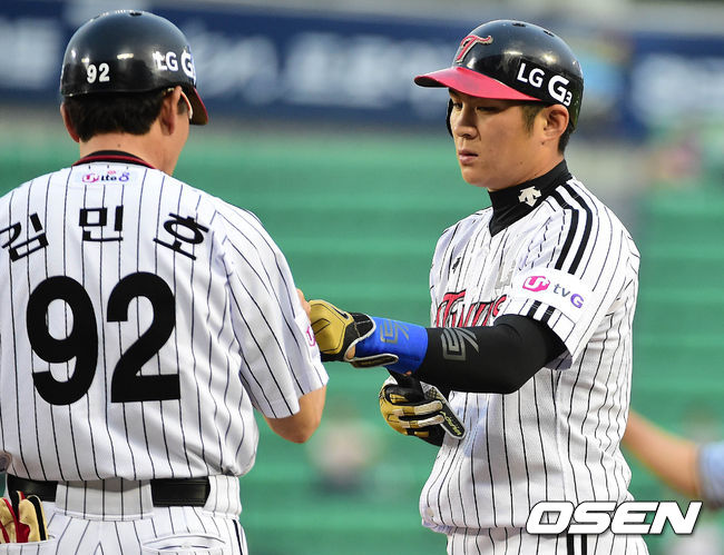 25일 오후 서울 잠실구장에서 열린 '2014 한국야쿠르트 세븐 프로야구' LG 트윈스와 NC 다이노스의 경기 3회말 1사 2루 오지환이 1타점 적시타를 치고 김민호 코치와 하이파이브를 하고 있다.