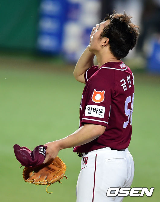 3회말 2사 2루에서 넥센 금민철이 강판당하며 아쉬워하고 있다.