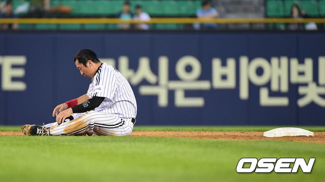 25일 오후 서울 잠실구장에서 열린 '2014 한국야쿠르트 세븐 프로야구' LG 트윈스와 NC 다이노스의 경기 4회말 2사 최경철 타석, 견제구에 아웃당한 2루주자 이병규가 그라운드에 앉아 있다.