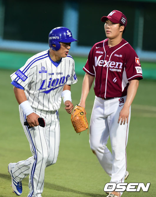 3회말 무사 1,2루에서 넥센 금민철이 삼성 박해민의 번트 타구에 1루로 악송구, 실점을 허용하며 아쉬워하고 있다. 득점에 성공하는 삼성 이승엽.