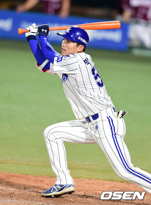 5회말 2사 2,3루에서 삼성 박해민이 2타점 적시타를 날리며 타구를 바라보고 있다.