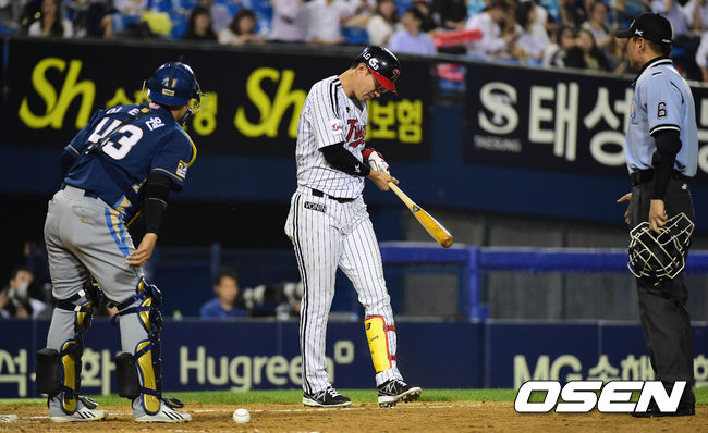 25일 오후 서울 잠실구장에서 열린 '2014 한국야쿠르트 세븐 프로야구' LG 트윈스와 NC 다이노스의 경기 8회말 1사 정성훈이 원종현의 투구에 몸을 맞고 고통스러워 하고 있다.