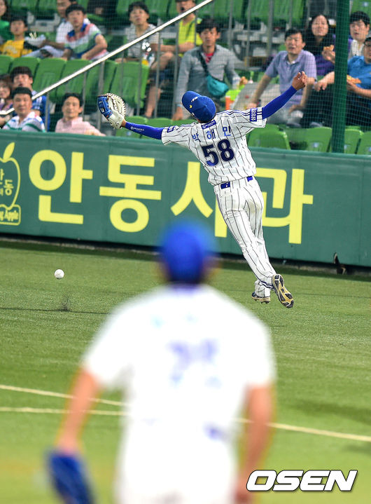 7회초 1사 1루에서 삼성 박해민이 넥센 김민성의 파울 파구를 아쉽게 놓치고 있다.