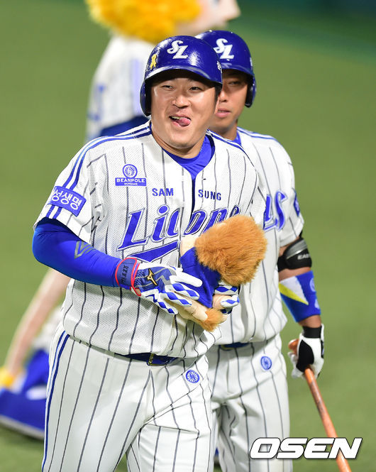 7회말 1사에서 삼성 최형우가 솔로포를 날리고 기뻐하고 있다.