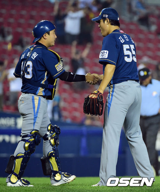 25일 오후 서울 잠실구장에서 열린 '2014 한국야쿠르트 세븐 프로야구' LG 트윈스와 NC 다이노스의 경기 종료 후 김진성과 이태원이 악수를 나누고 있다.
