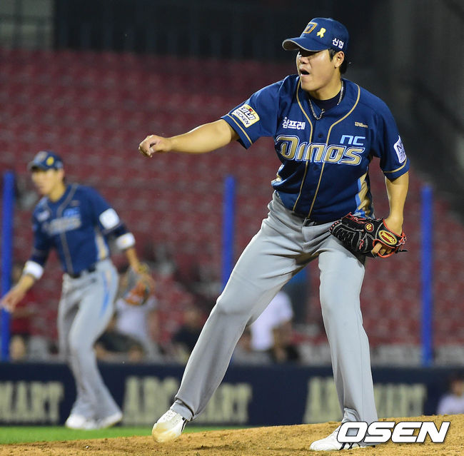 25일 오후 서울 잠실구장에서 열린 '2014 한국야쿠르트 세븐 프로야구' LG 트윈스와 NC 다이노스의 경기 9회말 2사 김진성이 김용의를 삼진으로 처리하고 있다.
