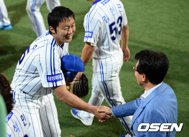 경기후 삼성 배영수가 김인 사장의 축하를 받고 있다. / jpnews@osen.co.kr