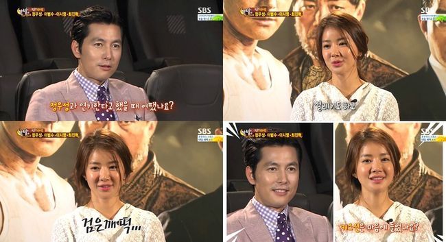 그는 이날 방송에서 "정우성과 함께 한다고 했을때 설렜다"며 "그런데 키스신을 찍기 전 뭘 드시더라"고 폭로해 정우성을 당황케 했다.