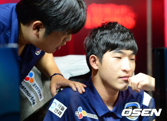 CJ 블레이즈가 '엠페러'김진현이 경기가 끝난뒤 여유로운 표정을 짓고 있다.