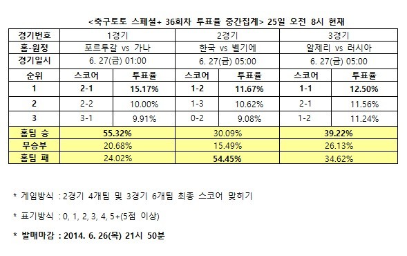 2014 브라질 월드컵 조별예선 3경기 대상 축구토토 스페셜+ 36회차 투표율 중간집계 결과