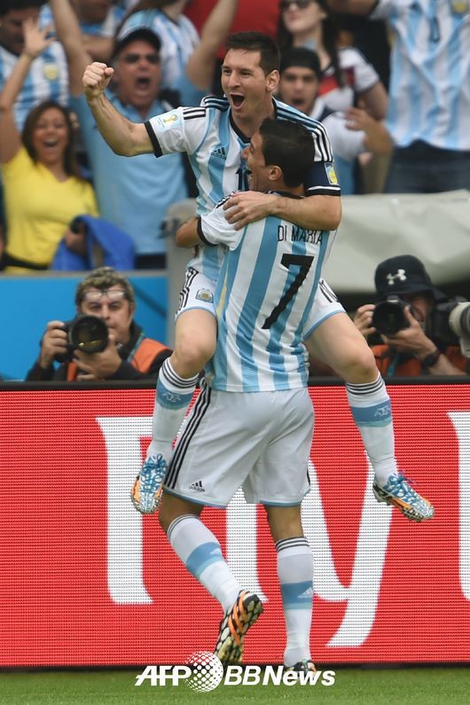 골을 넣은 아르헨티나 메시가 디 마리아와 기뻐하고 있다.