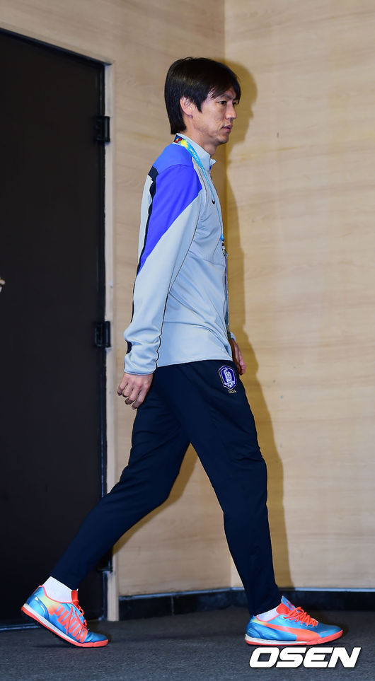 26일 오전(이하 한국시간) 홍명보 감독이 이끄는 축구국가대표팀이 브라질 상파울루의 아레나 데 상파울루 경기장에서 벨기에와의 조별리그 H조 3차전을 하루 앞두고 훈련을 가졌다. 훈련 후 기자회견장으로 홍명보 감독이 입장하고 있다.