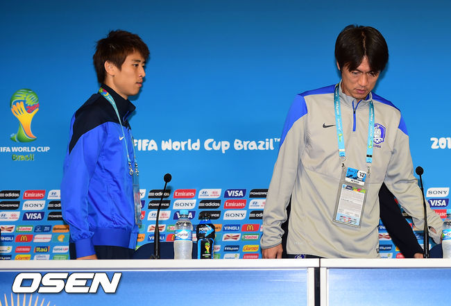 26일 오전(이하 한국시간) 홍명보 감독이 이끄는 축구국가대표팀이 브라질 상파울루의 아레나 데 상파울루 경기장에서 벨기에와의 조별리그 H조 3차전을 하루 앞두고 훈련을 가졌다. 훈련 후 기자회견에서 홍명보 감독과 구자철이 입장하고 있다.